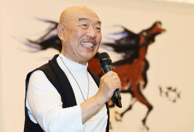 한편 이날 강연에 앞서 중요무형문화재 제68호 밀양 백중놀이 예능보유자인 하용부의 '듣는 춤, 보리 소리 영무(靈舞)' 공연이 선보였다. 이후 이 화백의 '드로잉 퍼포먼스'도 이어졌다. 캔버스 뒤에서 물감을 입혀 앞으로 뛰는 말 형상의 그림을 그려내는 퍼포먼스다. 잔잔한 클래식 음악이 흘러나오는 가운데 간간이 '하아' 하는 이 화백의 구령 소리가 어우러져 보는 이들의 눈과 귀를 사로잡았다. 강연이 끝난 후에는 참석자 2명을 대상으로 이 화백이 글자 그림을 그려주는 이벤트도 진행됐다.