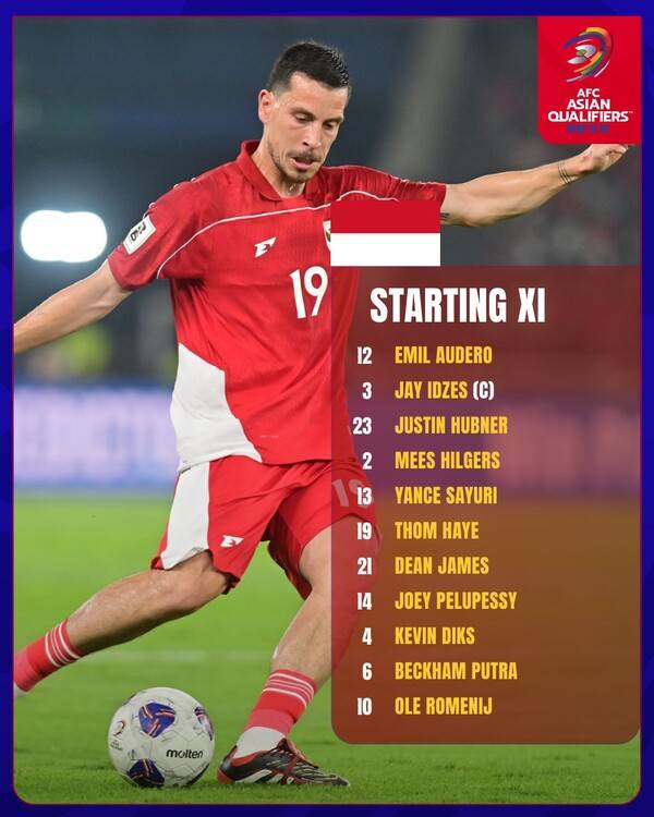 이에 맞서는 인도네시아도 3-4-2-1 포메이션을 꺼내 들었다. 에밀 아우데로가 골문을 지켰고, 저스틴 허브너, 제이 이즈스, 메이스 힐허르스가 백3를 구성했다. 케빈 딕스, 얀스 사유리가 좌우 윙백을, 조이 펠루페시, 톰 헤이가 중원을 담당했다. 딘 제임스, 베컴 푸트라가 2선으로, 올레 로메니가 최전방 스트라이커로 출전했다.