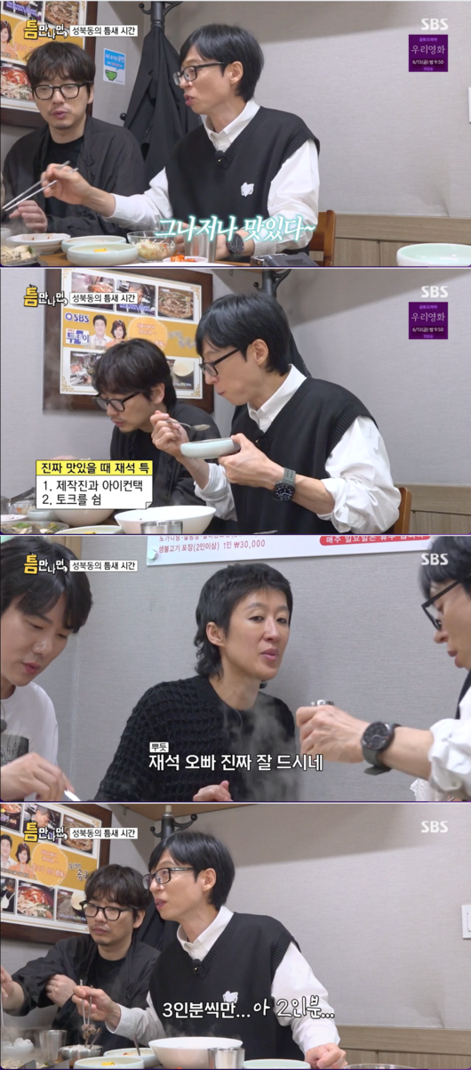 홍진경은 유연석의 나이와 집 등을 물었고, 유재석은 “연석이한테만 질문을 하네”라고 말해 웃음을 자아냈다. 열심히 식사를 하는 유재석은 “포장해서 아이들 줘도 좋겠다”라며 음식 맛에 감탄했다.