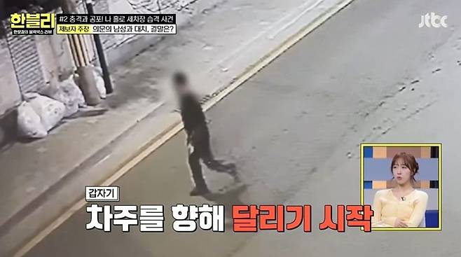남자는 차 천장을 손으로 내리치기 시작했고, 차주는 "그때부터 무서웠다. 무슨 얘기를 하는지 몰라서 영상을 찍기만 했다. 근데 절 위협하면서 다가오더라. 칼부림 사건도 많았고, 정신적으로 이상한 사람 같아서 도망갔다. 주변에 사람도 없어서 무서웠다"라고 밝혔다.