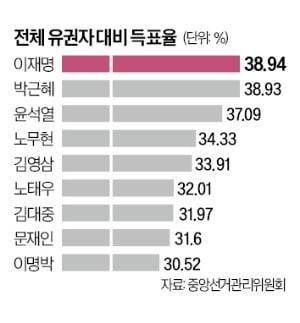 누구도 지지하지 않은 사람까지 포함한 전체 유권자 수 대비 이 대통령의 득표율은 38.94%로 집계됐다.