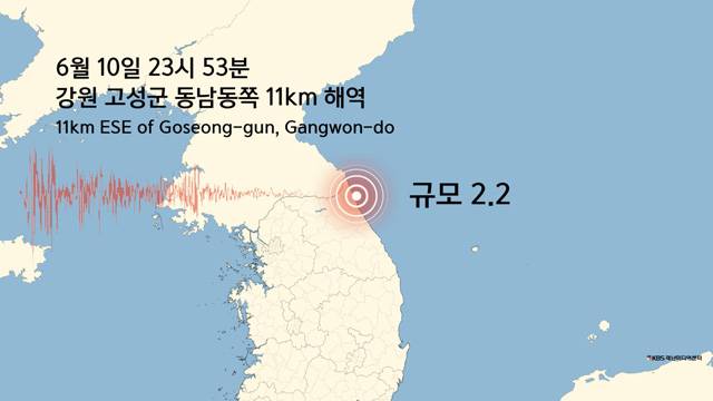 오늘(10일) 밤 11시 53분에 강원 고성군 부근 해역에서 규모 2.2의 지진이 발생했습니다.