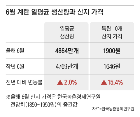 10일 한국농촌경제연구원에 따르면, 이달 일평균 계란 생산량은 4864만개로 전년 동월(4769만개)보다 2% 늘어날 것으로 전망된다. 그런데 정작 이달 계란 산지 가격은 특란 10개당 1850~1950원으로 전년 동월(1646원) 대비 12.4~18.5% 대폭 오를 것으로 전망된다. 공급이 늘어나는데도 가격이 되레 뛰어오르는 상황이다.