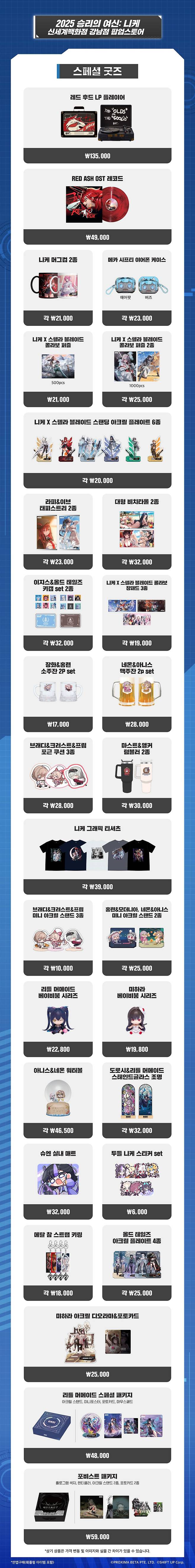 해당 행사의 꽃인 스페셜 굿즈 중 유저들의 최대 관심사는 '레드 후드 LP 플레이어'와 'RED ASH OST 레코드'다. 이외 메가 시프트 이어폰 케이스, 네온&아니스 맥주잔 2P 세트, 도로시&리틀 머메이드 스테인드글라스 조명, 1000피스 퍼즐이 주목을 받고 있다.