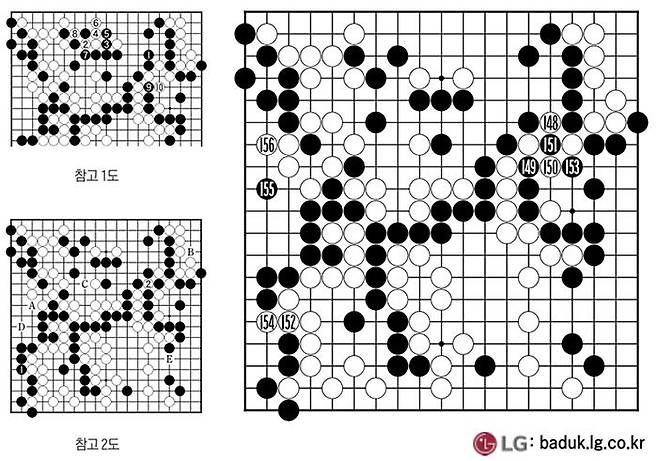 152에 153으로 불청한 수에는 팻감 판단에 착오가 있었을까. 참고 2도 1에 받는 한 수였다. 흑의 팻감은 A~C 세 곳, 백의 팻감은 D~E 정도라서 팻감은 흑이 많다. 갑자기 큰 변화가 생겼다.