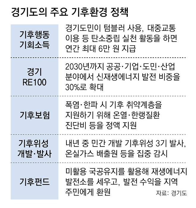 경기도는 지난해 8월 기후위기 대응과 지역 경제 발전을 함께 실현하겠다는 목표 아래 기후보험·기후위성·기후펀드 등 ‘기후 3대 프로젝트’를 발표했다.