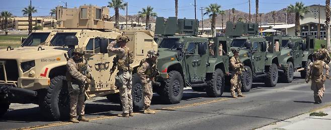 | LA로 출동 준비하는 美 해병대 9일 미 해병대 제1해병사단 소속 군인 약 700명이 불법 이민자 단속 및 추방 작전에 반발하는 시위를 진압하기 위해 캘리포니아주 로스앤젤레스(LA)로 출동 준비를 하고 있다. 앞서 도널드 트럼프 대통령은 7일 주방위군 2000명을 LA에 투입하라고 명령한 데 이어 이날 주방위군 2000명 증원을 추가로 지시했다. 사진 출처 미국 북부 사령부 X |