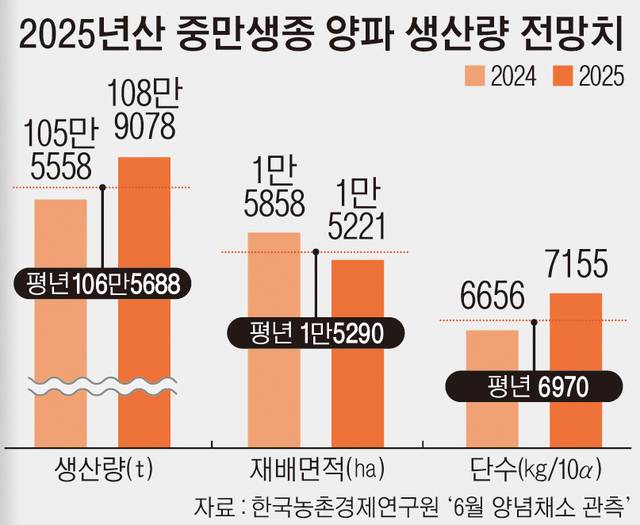 ◆ 중만생양파 생산량 전년·평년보다 3.2%·2.2% 증가=한국농촌경제연구원이 4일 내놓은 ‘6월 양념채소 관측’에 따르면 올해산 중만생종 양파 생산량은 108만9078t으로 전망됐다. 전년(105만5558t)보다 3.2%, 평년(106만5688t) 대비해선 2.2% 증가했다. 농경연 관계자는 “재배면적은 전년보다 4.0% 줄었지만 기상 여건이 좋아 생육이 원활했고, 특히 지난해 노균병 피해가 컸던 호남지역 작황이 매우 양호해 단수가 크게 오르면서 전체 생산량이 늘었다”고 말했다.