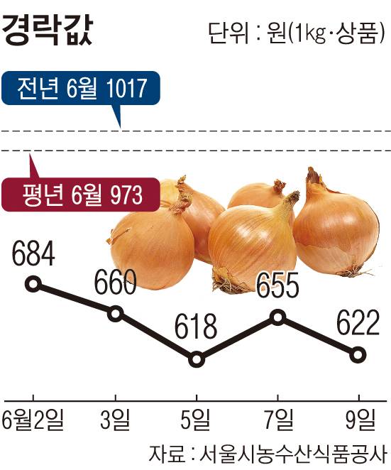 다만 경남지역은 다른 지역보다 생육이 지연되는 것으로 파악됐다. 올해 1∼3월 저온현상·가뭄이 있었고, 4월에는 눈·서리 등이 내리면서 양파 생육이 늦어졌다는 게 농경연의 분석이다. 9일 서울 가락시장에서 양파는 1㎏ 상품 기준 622원에 거래됐다. 전년 6월 평균값(1017원)보다 38.8%, 평년(973원)보다 36.1% 낮다. 생산량 증가세(3.2%)에 비해 시세 하락폭(38.8%)이 큰 상황이다.
