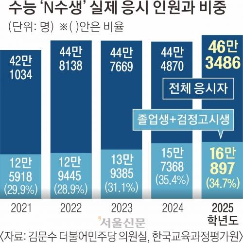 기숙과 독학을 포함해 오프라인 대형 N수 학원이 늘어나는 건 실제 수능을 보는 N수생이 매년 급증하기 때문이다. 서울신문이 김문수 더불어민주당 의원실에서 받은 한국교육과정평가원의 ‘수능 재학생·졸업생 응시인원 및 비중’에 따르면, 실제 수능날 시험을 친 N수생은 2016학년도 13만 6274명(전체 수험생의 23.3%)에서 2025학년도 16만 897명(34.7%)으로 10년 새 2만 4623명(18%) 증가했다.