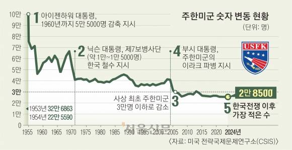 한미 방위비 협상은 아직 시작되지 않았지만 주한미군 2만 8500명 가운데 4500명을 감축할 가능성이 제기됐다. 한국전쟁 이후 계속 숫자가 줄고 있는 주한미군 가운데 스트라이커 전투여단 약 4500명을 괌으로 순환 배치할 것이라는 전망까지 나왔다.