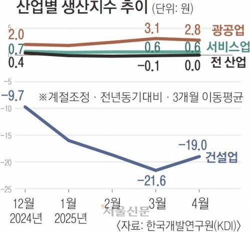 KDI는 10일 발표한 ‘경제동향 6월호’에서 “최근 우리 경제는 건설업이 부진한 가운데 수출도 둔화하면서 경기 전반이 미약한 상태에 머물러 있다”고 평가했다. 건설투자의 큰 폭 감소가 내수 회복을 제약하고 있고 미국으로의 자동차 수출이 급감하는 등 관세 인상 영향도 본격적으로 나타나고 있어서다. 정규철 KDI 경제전망실장은 ‘경기 미약’이라는 이례적 표현을 쓴 데 대해 “경기가 지난달보다 더 나빠지진 않았지만, 경제 활력이 없는 상황이 지속됐다는 의미”라고 설명했다.