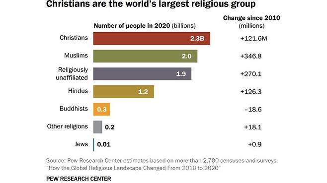 조사 기간 기독교인은 10년 사이에 1억 2천200만 명 증가한 23억 명에 달했습니다.