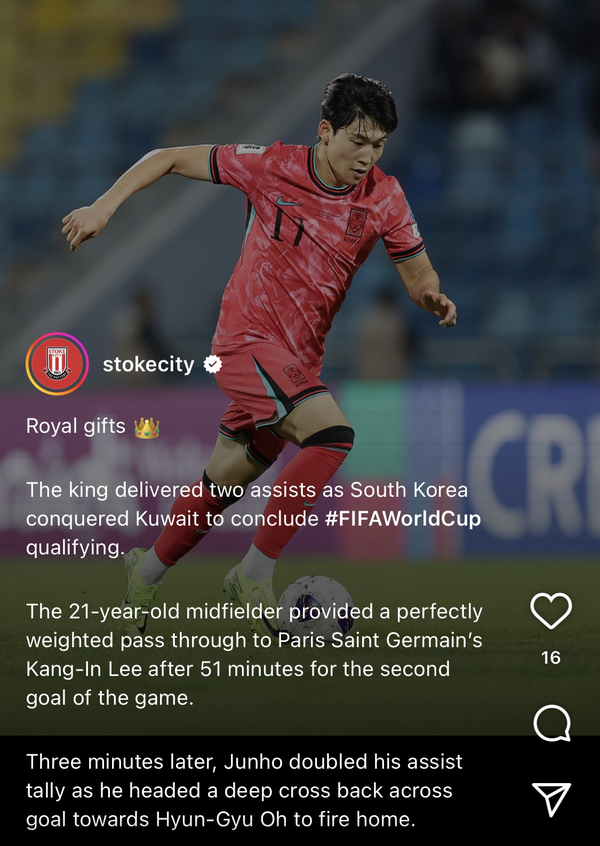 최고의 활약상을 보여준 배준호. 스토크가 이를 놓칠 리 없었다. 스토크는 경기 종료와 함께 공식 채널을 통해 배준호의 쿠웨이트전 활약상을 빼곡히 나열했다. 주목할 만한 부분이 있었다. 스토크는 첫 번째 문장의 주어를 ‘배준호’가 아닌 ‘The King(왕)’으로 칭했다.