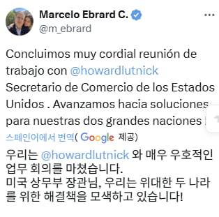 마르셀로 에브라르드 멕시코 경제장관은 9일 저녁 행사에서 미국이 멕시코에서 수입하는 것보다 더 많은 철강을 멕시코에 수출하고 있는 만큼 관세가 정당화되지 않는다고 미국 관료들에게 말했다고 밝혔다. 그는 지난 6일 워싱턴에서 러트닉 장관과 웃으며 악수하는 사진을 올렸다. 모종의 협상이 거의 완료되었음을 시사한 것이다.