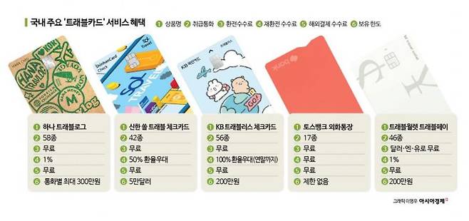 해외여행에 특화된 체크카드인 '트래블카드' 인기는 여전히 뜨겁다. 국내 시중은행과 토스뱅크, 카카오뱅크 등 대부분의 은행이 잇따라 상품을 내놓고 경쟁적으로 다양한 서비스를 제공하고 있다. 해외여행을 준비하고 있다면 우선 이들 중 하나를 골라 미리 발급해 두는 것이 좋다.