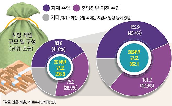 지방 이전 재원은 빠른 속도로 증가해 왔다. 한국지방세연구원에 따르면 2014년 75조2000억원 수준이던 이전 수입은 지난해 151조2000억원으로 10년 새 두 배 가까이 늘었고, 지방 세입 내 비중도 36.9%에서 42.9%로 상승했다. 지방 이전 수입의 증가는 인구 유출로 인한 지역 소멸 위기와 생산성 저하에 대응하기 위한 불가피한 조치로 평가된다.