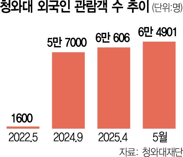 실제 청와대에 발걸음한 외국인 관광객 수도 크게 늘었다. 청와대재단에 따르면 4월과 5월 청와대에 방문한 외국인 관람객 수는 각각 6만 606명, 6만 4901명에 달했다. 개방 초반인 2022년 5월 1600명에 그쳤던 게 지난해 9월 5만 7000명까지 늘더니 탄핵 국면을 거치고 나선 6만 명을 돌파한 것이다. 개방 이후 5월 말까지 누적 외국인 관람객도 93만 1277명에 달해 조만간 100만 명을 넘길 것으로 관측된다.
