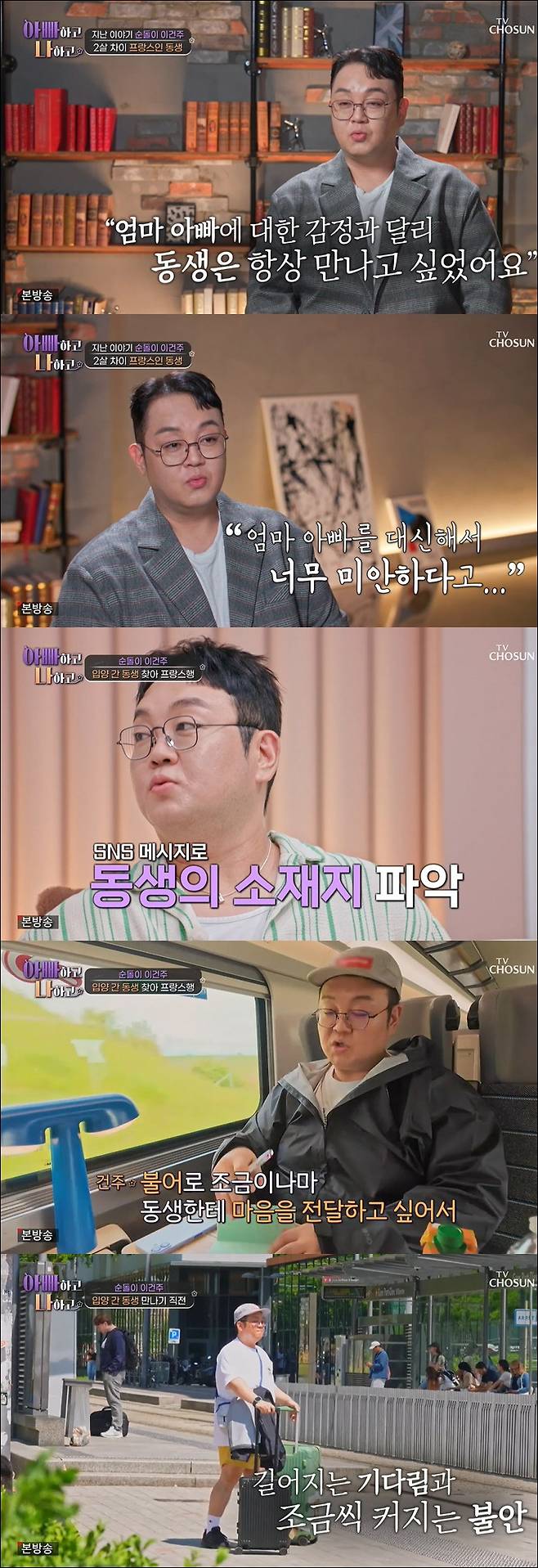 동생을 너무 만나보고 싶다는 이건주는 동생을 보기 위해 프랑스 리옹으로 향했다. 동생을 보러 가는 기차 안, 이건주는 "무슨 일을 하는지 밥은 잘 먹는지 아픈 데는 없는지. 궁금하다기보다는 걱정인 거 같다. 엄마가 저한테 하셨던 말을 제가 하고 있다. 신기하다"며 "만나게 된다면 우선 건강하게 잘 있어줬으면 좋겠다. 그래야 덜 미안할 거 같다"고 긴장된 모습을 보였다.