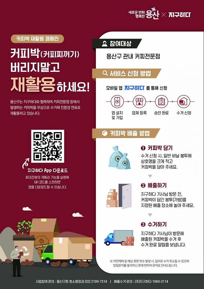 사업은 모바일 애플리케이션 ‘지구하다’에서 배출 신고, 무상 수거, 재활용 처리까지 일괄 체계로 운영된다. 참여를 원하는 커피전문점은 앱에서 직접 수거 신청을 하고, 신청 날짜 전일 점포 앞에 커피박을 배출하면 된다.