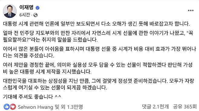이 글에서 이 대통령은 “대통령 시계 관련해 언론에 일부만 보도되면서 다소 오해가 생긴 듯해 바로잡고자 한다”며 “얼마 전 민주당 지도부와의 만찬 자리에서 자연스레 시계 선물에 관한 이야기가 나왔고, ‘꼭 필요할까요?’라는 취지의 말씀을 드렸다”고 소개했다.