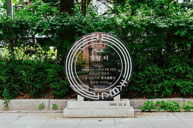 조선어학회는 맞춤법과 외래어 표기법을 정리해 <우리말 큰사전>을 편찬한 곳이다. 조선어학회 터 표석 앞 좁은 골목 안쪽 2층 건물에 그 사무실이 자리했었다. 1층은 이극로 선생이 머물렀고, 2층은 학회 사무실로 사용했다고 한다.