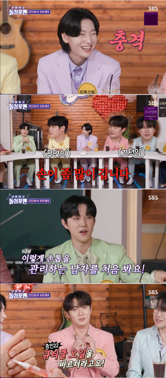 10일 오후 방송된 SBS '신발 벗고 돌싱포맨'에는 '미스터트롯3'의 주인공, 김용빈 X 손빈아 X 춘길 X 최재명 X 추혁진이 등장해 돌싱포맨과의 역대급 케미를 뽐냈다.