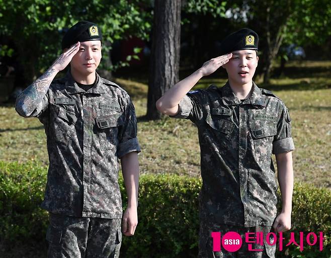 [텐아시아=조준원 기자]군 복무를 마치고 만기 전역한 그룹 방탄소년단(BTS)의 지민과 정국이 11일 경기도 연천군 연천공설운동장에 마련된 전역식 행사 자리에서 취재진들을 향해 경례 포즈를 하고 있다.