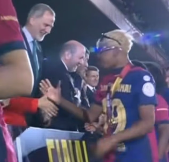 당시 ESPN은 바르셀로나 선수들이 트로피와 메달을 받는 순간을 영상으로 공개하며, 야말이 선글라스 2개와 뒤집어 입은 셔츠 차림으로 국왕 앞에 섰다고 전했다.