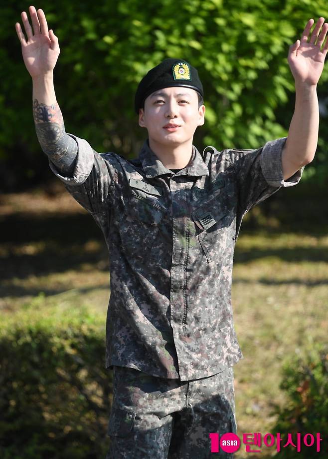 [텐아시아=조준원 기자]군 복무를 마치고 만기 전역한 그룹 방탄소년단(BTS)의 정국이 11일 경기도 연천군 연천공설운동장에 마련된 전역식 행사 자리에서 취재진들을 향해 경례 포즈를 하고 있다.