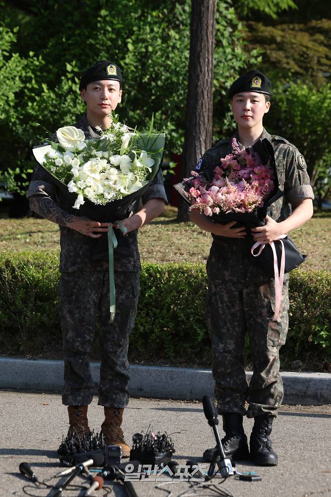 군 복무를 마친 그룹 방탄소년단(BTS) 정국과 지민이 11일 오전 경기 연천군 연천공설운동장에서 진행하는 전역 행사에 참석하고 있다.
