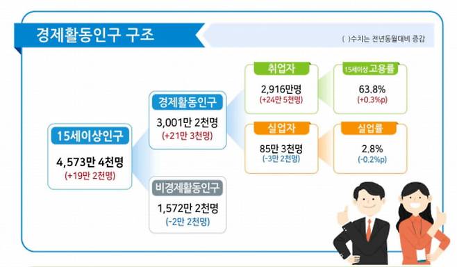 전체 경제활동인구는 3012만명으로 관련 통계가 시작된 1999년 이래 처음으로 3000만명을 돌파했다. 노년층의 노동시장 재진입이 큰 영향을 준 것으로 분석된다.