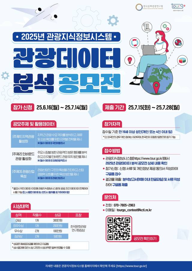 한국문화관광연구원(원장 김세원)은 '관광데이터에 대한 국민의 관심을 도모하고, 데이터의 이용을 증진하기 위해 2025년 관광데이터 분석 공모전'을 개최한다고 11일 밝혔다.
