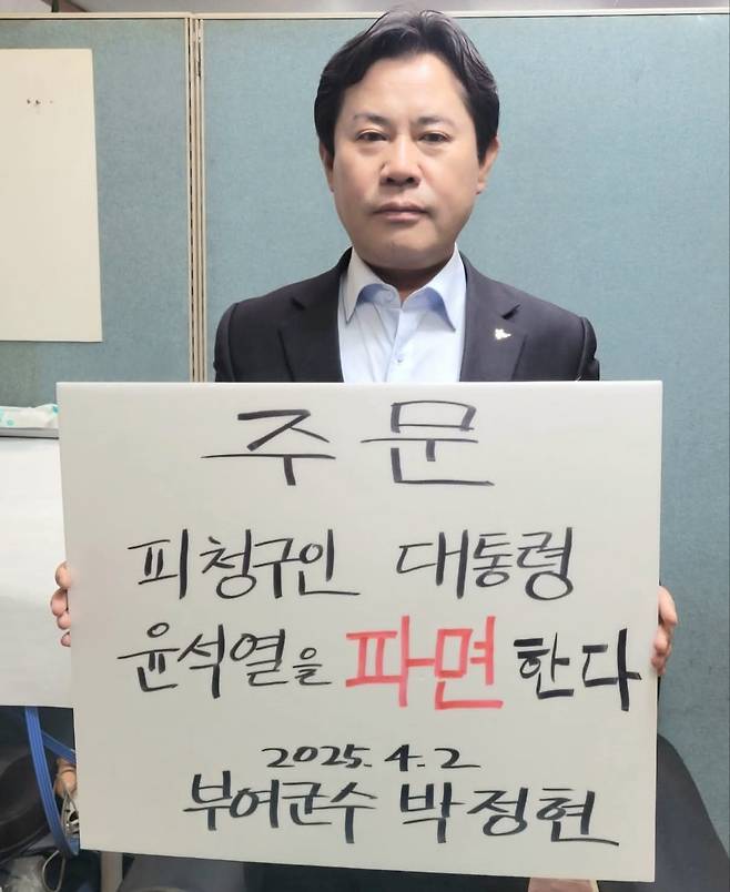 | ▲ 지난 4월 박정현 군수가 페이스북에 윤석열 파면 촉구 피켓을 든 사진을 공개했다. |