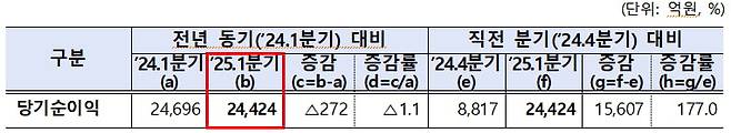 금융감독원이 11일 발표한 '2025년 1분기 증권·선물회사 영업실적'에 따르면 국내 증권사 60곳의 1분기 순이익은 2조4424억원으로 집계됐다, 한해 전보다 272억원(1.1%) 감소했다.