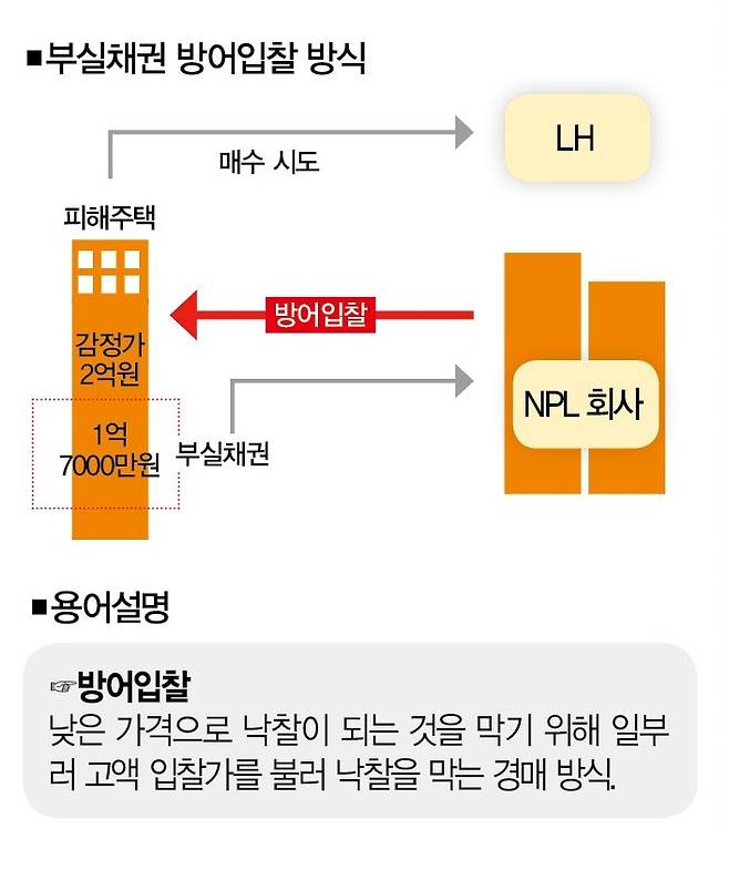 이럴 때를 대비해 돈을 빌려준 채권자, 대표적으로 은행들은 채권을 팔아 넘긴다. 부실채권(Non Performing Loan·NPL) 투자를 전문으로 하는 회사들에게 해당 주택에 걸려 있는 부실채권을 매각한다. 이 회사들은 낙찰 가격을 끌어올리기 위해 '방어입찰'을 단행한다. LH가 제시한 가격에 최대한 맞추거나 이를 웃도는 가격으로 입찰을 붙인다. 자칫 회사 측에서 낙찰을 받으면 곧바로 취소한다. 일종의 꼼수다.