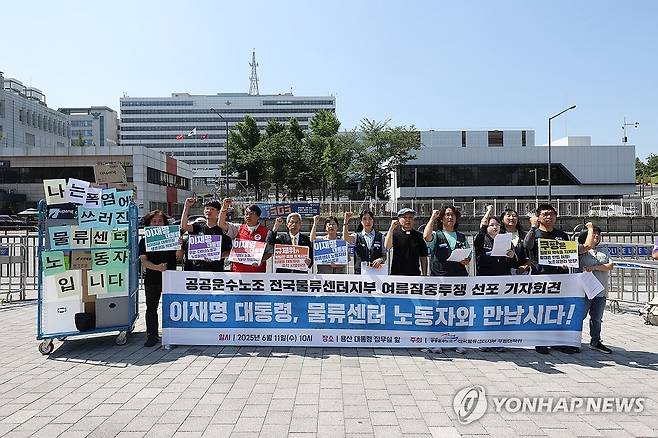 (서울=연합뉴스) 임화영 기자 = 공공운수노조 전국물류센터지부 조합원들이 11일 서울 용산 대통령 집무실 인근에서 여름 집중 투쟁 선포 기자회견을 열고 폭염 대비 냉방대책과 휴게시간을 촉구하고 있다. 2025.6.11