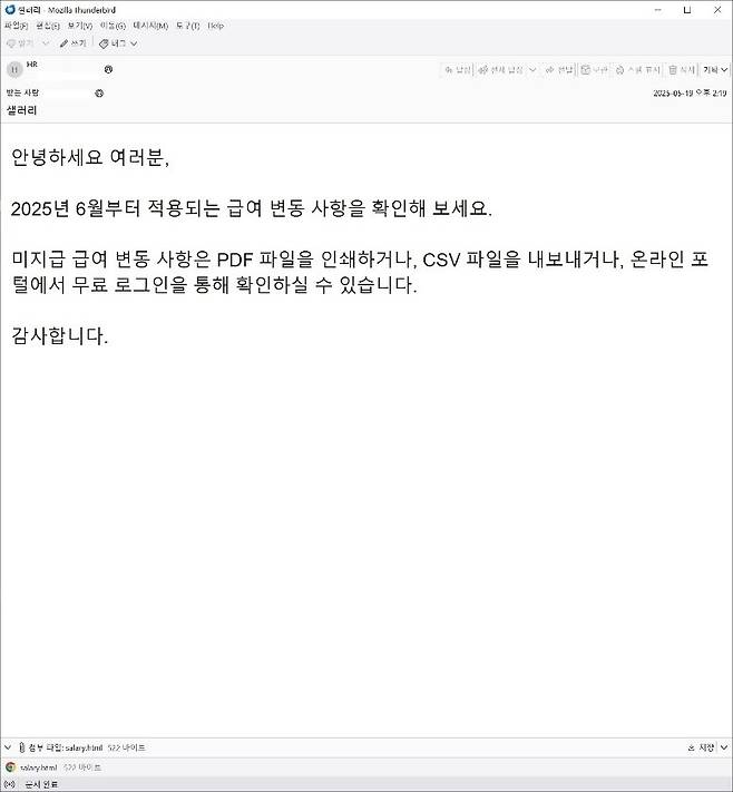 안랩에 따르면 최근 기업 인사 부서를 사칭해 '2025년 6월부터 적용되는 급여 변동 사항을 확인'하라는 내용의 피싱 메일이 유포, 계정 탈취를 시도한 정황이 확인됐습니다.