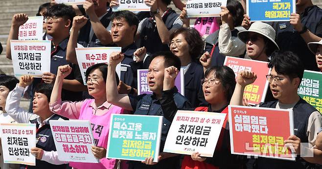 [서울=뉴시스] 추상철 기자 = 모두를 위한 최저임금 운동본부가 11일 오전 서울 종로구 세종문화회관 계단에서 '2026년 적용 최저임금요구안 시급 1만1500원 발표' 기자회견을 하고 있다. 2025.06.11. scchoo@newsis.com