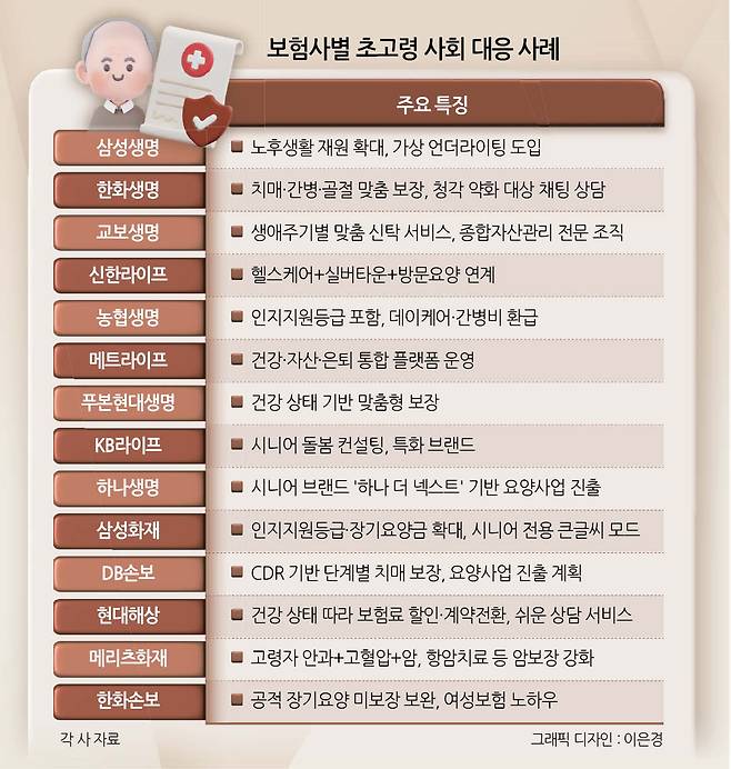 대표적으로 삼성생명은 초고령화 사회의 안전망 역할을 수행할 수 있는 보험을 선보였다. 지난해 10월 기존 종신보험 한계를 극복하고 가입자의 안정적인 노후 생활을 위한 재원으로 종신보험의 역할을 확대한 ‘삼성 밸런스 종신보험’을 내놨다. 올해 5월엔 노후 전반의 건강 지원부터 질병 치료와 돌봄까지 보장할 수 있는 ‘웰에이징 건강보험’을 선보이는 등 시니어 종합 보장을 강화 중이다.