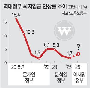 최저임금위원회가 새 정부 첫 최저임금을 논의하는 가운데 양대 노총이 11일 내년도 최저임금으로 올해보다 14.7% 오른 1만1500원을 요구했다. 경영계는 경기 침체와 소상공인들의 어려움을 감안해 최저임금 인상 폭을 최소화해야 한다는 입장이어서 양측 간 치열한 공방이 이어질 전망이다. 특히 문재인 정부 첫해에 결정된 최저임금(2018년도)은 전년도에 비해 16.4%나 올라 이번에 결정될 내년도 최저임금 수준은 이재명 정부의 노동정책을 가늠할 수 있는 방향타가 될 것으로 보인다.