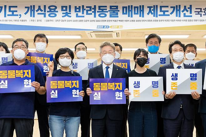 | ▲ 2021년 6월 22일 당시 이재명 경기도지사는 서울 여의도 이룸센터 이룸홀에서 열린 '개식용 및 반려동물 매매 제도개선 국회토론회'에 참석했다. 이날 토론회에는 안민석·이규민·박홍근·심상정·김홍걸·소병훈·이동주·양정숙·이학영 국회의원 등을 비롯해 이항 서울대학교 수의과대학 교수, 전진경 (사)동물권행동카라 대표, 서국화 동물권연구변호사단체(PNR) 대표 등이 참석했다. |