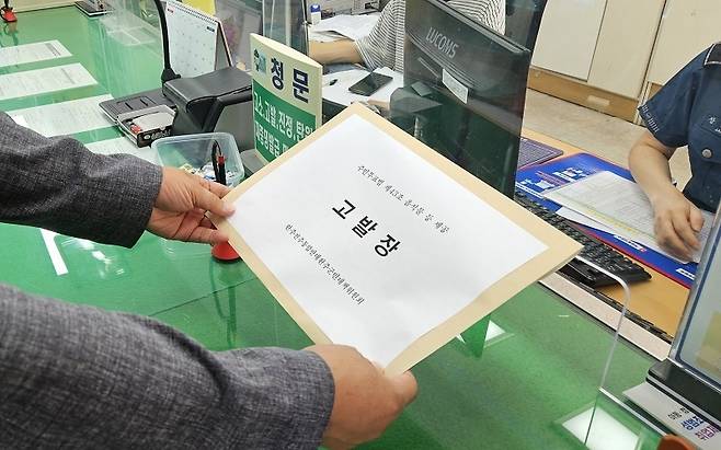 | ▲ 완주전주통합반대대책위원회 관계자가 11일 완주경찰서에 고발장을 접수 중이다. |