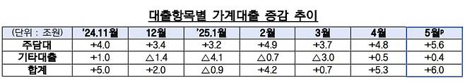 금융위원회와 금융감독원이 11일 배포한 ‘2025년 5월중 가계대출 동향(잠정)’ 자료에 따르면 금융권 가계대출은 지난달 6조원 증가한 것으로 집계됐다. 금융권 가계대출은 지난 2월 4조2000억원 급증했다. 가계대출이 통상 줄어드는 지난 3월에도 7000억원 증가했으며, 4월엔 5조3000억원으로 증가폭이 확대됐다.
