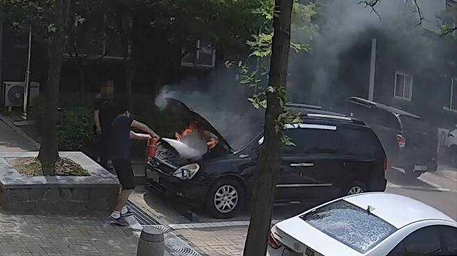 아파트 주차장 차량 화재…비번 소방관이 신속 대처