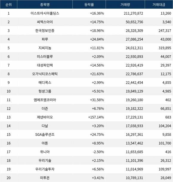 [서울데이터랩]금일 코스닥 거래량 1위 이스트아시아홀딩스 거래대금 무려 132억 돌파