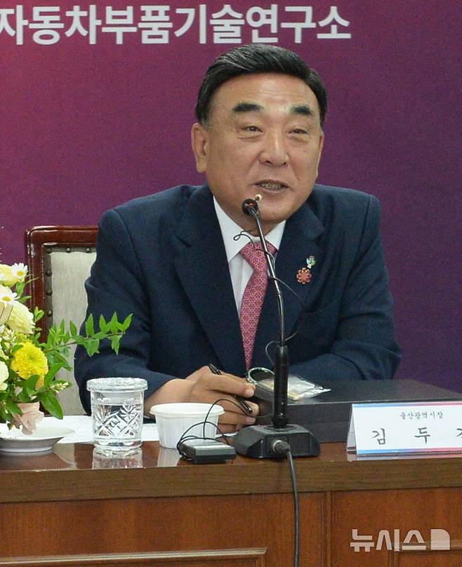 [울산=뉴시스] 배병수 기자 = 김두겸 울산시장이 11일 북구 울산테크노파크 자동차부품기술연구소 2층 회의실에서 열린 울산 자동차부품산업의 발전을 위한 중소기업 현장 소통 간담회에서 인사말을 하고 있다. 2025.06.11.bbs@newsis.com.