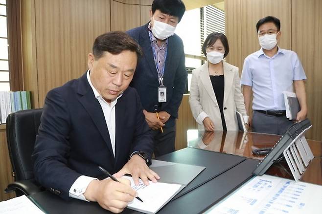 | ▲ 김종훈 울산 동구청장이 2022년 7월, 지방선거 당선 1호 결재로 동구노동복지기금안에 서명하고 있다. |
