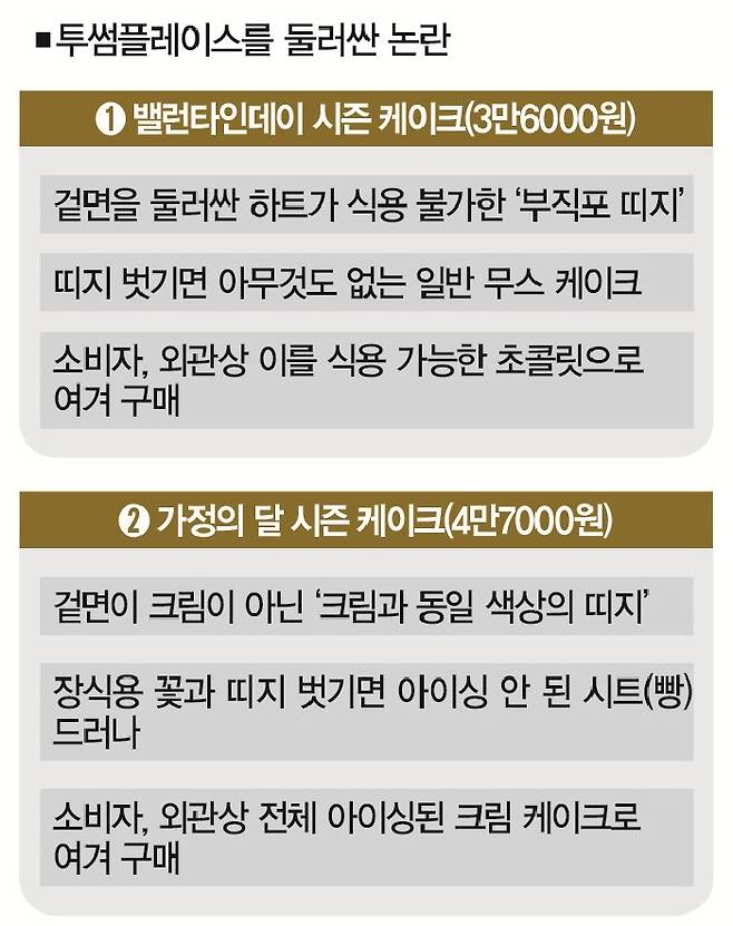 하지만 실상은 하트 모양의 '부직포 띠지'로 감싼 구조였다. 띠지를 벗기면 일반적인 외형의 무스 케이크가 드러났다. 이 케이크는 인기 먹방 유튜버의 리뷰 영상에서 '소비자 기만 케이크'로 질타를 받았다.
