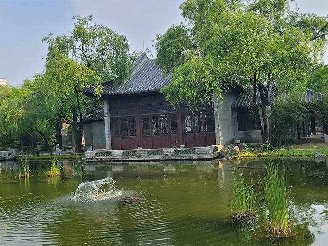 월화원 정문을 지나 석교를 건너면 연못과 작은 폭포가 시선을 끈다. 부용사와 월방, 분재원까지 이어지는 길은 짧지만 밀도 있게 구성돼 있다. 땅을 파서 연못을 만들고 파낸 흙으로 산을 만들었다. 산 정상에 중연정을 지었다.